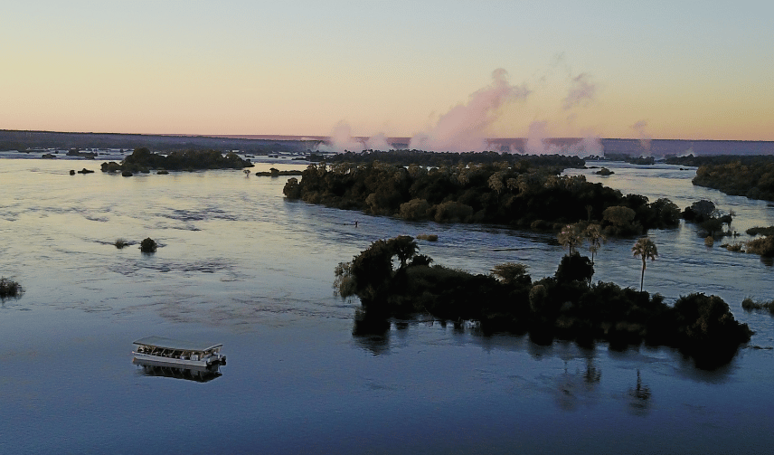 Thesunset cruise offers a relaxing journey along the Zambezi River as the sky glows with sunset colors.