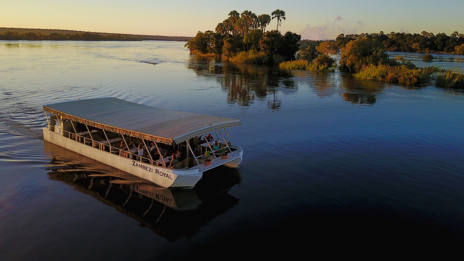 Thesunset cruise offers a relaxing journey along the Zambezi River as the sky glows with sunset colors.